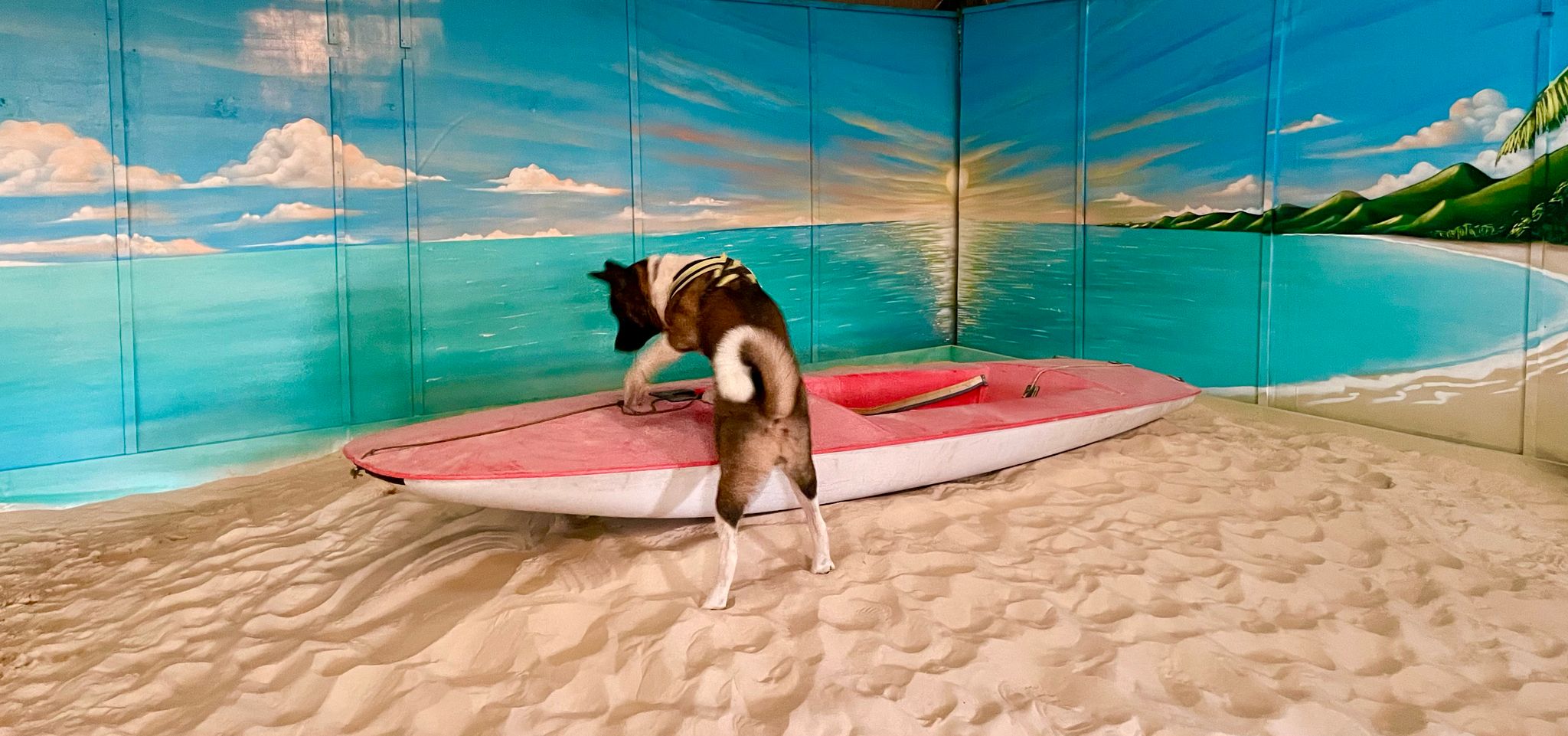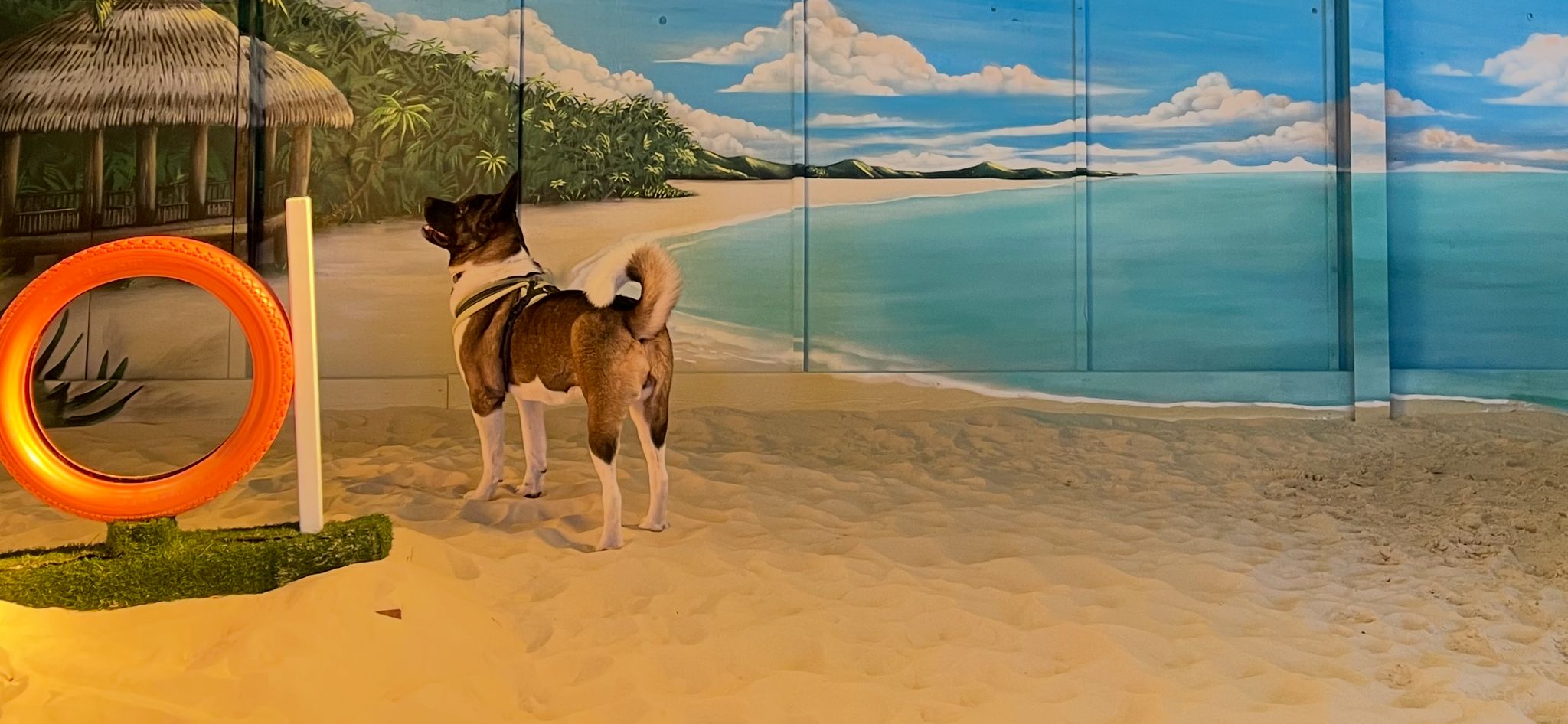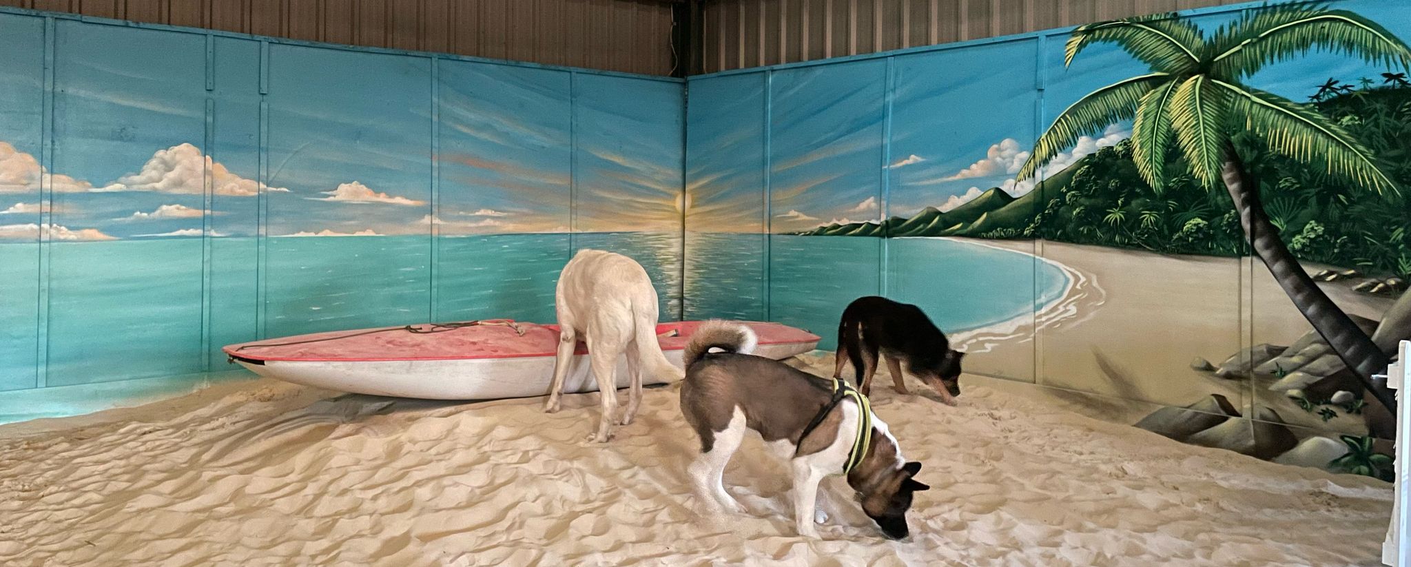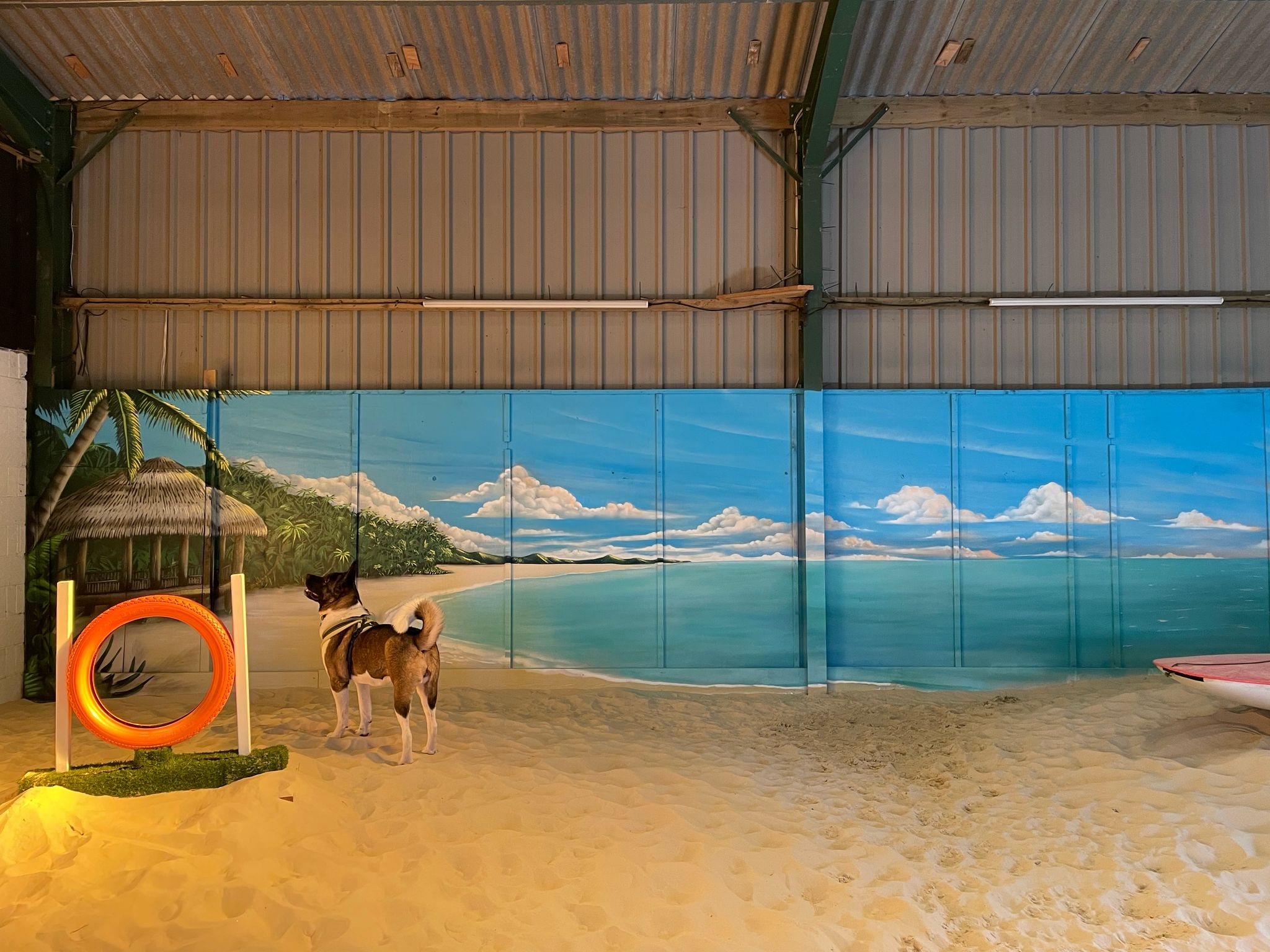 At Dog Adventure Barn, our hand-painted mural walls create a unique and immersive experience, transporting your dog to a scenic beach setting.